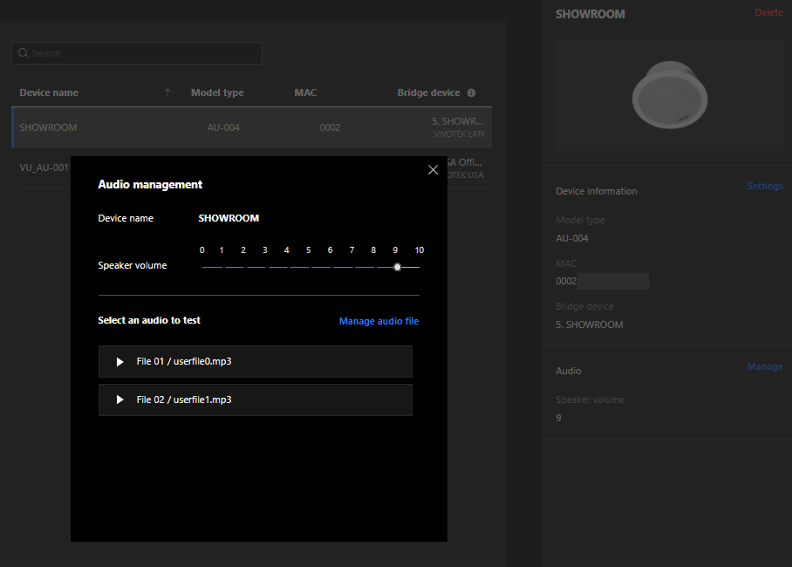 VORTEX es compatible con los altavoces VIVOTEK, lo que permite a los usuarios cargar archivos de audio directamente a través de la interfaz de VORTEX y activar transmisiones dentro de la configuración de la alarma.