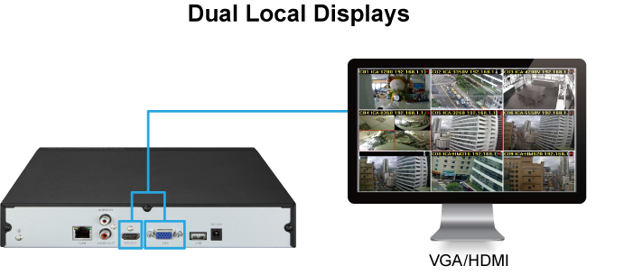 El NVR-1600 viene con interfaces de salida de video HDMI y VGA para pantalla local dual. Se puede conectar a un monitor HDMI 4K y a un monitor VGA 1080p por separado, donde los contenidos de visualización en directo o los contenidos de reproducción se pueden mostrar simultáneamente. Con la función de pantalla local dual, los usuarios pueden monitorear localmente con alta flexibilidad en una resolución de pantalla diferente, eliminando así la necesidad de una PC separada para ver video desde la unidad. Además, el NVR también se puede operar con el mouse USB para configurar y monitorear todos los sistemas fácilmente.